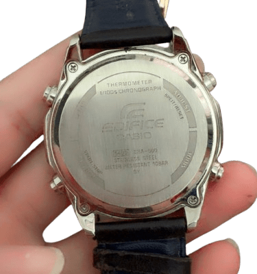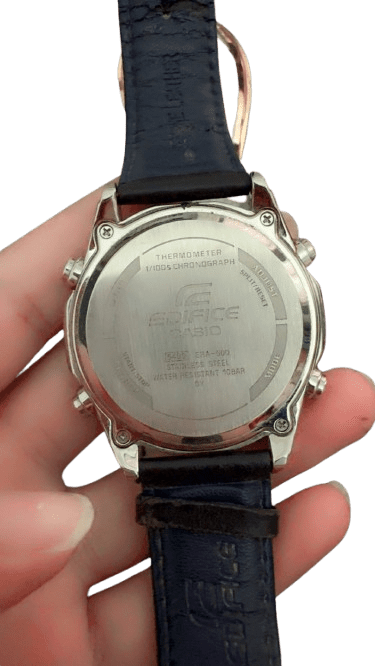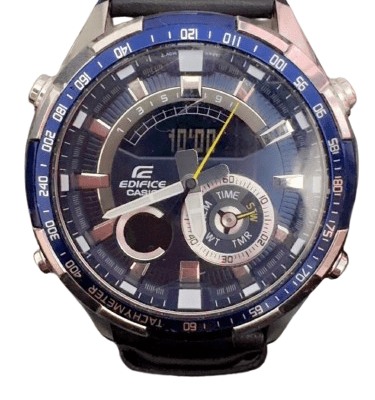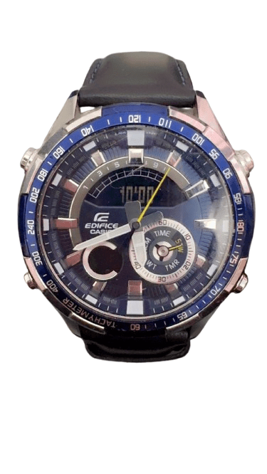 The Casio Edifice 350 (caseback marked ERA‑600) is a sporty, motorsport‑inspired analogue‑digital timepiece designed for everyday reliability with added instrument-style functionality. A multi‑layer blue dial, bold hour markers and tachymeter bezel give it a performance look, while the built‑in thermometer and 1/100‑second chronograph add genuine practical value beyond standard timekeeping. Finished in stainless steel with a leather strap, it transitions easily from daily wear to weekend use.