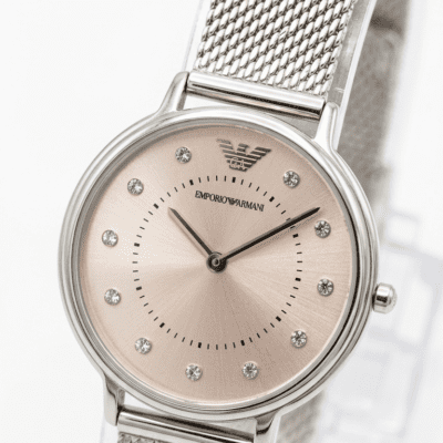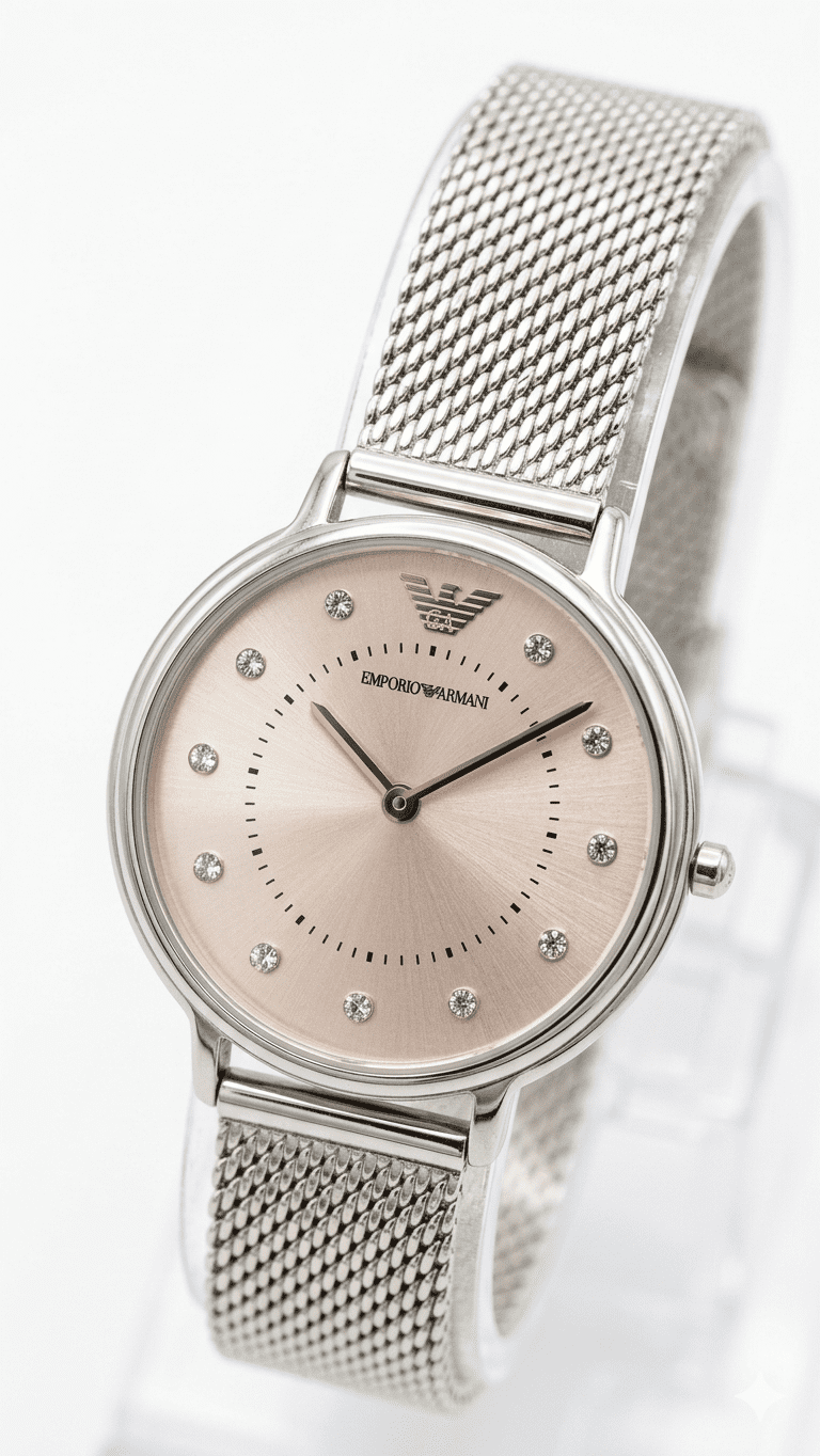 Designed with Emporio Armani’s signature clean aesthetic, this stainless steel timepiece pairs a polished, slim-profile case with a shimmering sunray dial for a sleek, modern finish. Crystal-set hour markers add subtle sparkle without overpowering the minimalist look, making it ideal for both daywear and evening occasions.