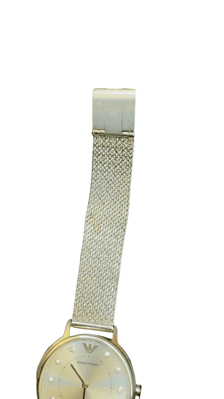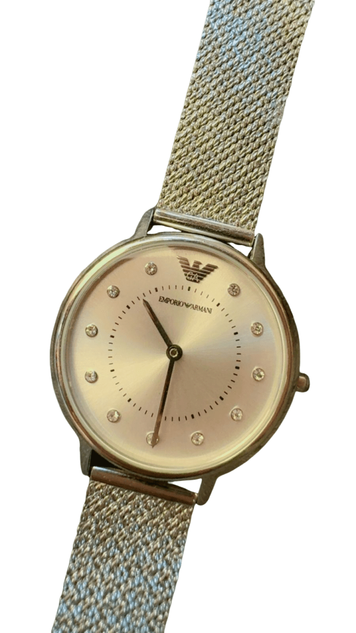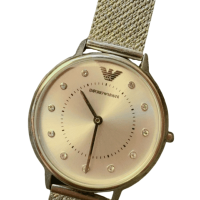 A refined Emporio Armani stainless steel watch featuring a slim gold‑tone case, minimalist sunray dial with crystal hour markers, and a comfortable mesh bracelet. This elegant everyday piece dresses up effortlessly.